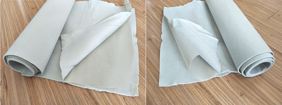 復合土工膜是在薄膜的一側或兩側經過烘箱遠紅外加熱,把土工布和土工膜經導輥壓到一起形成復合土工膜。隨著生產工藝的提高,還有一種流延法做復合土工膜的工藝。其形式有一布一膜、二布一膜、兩膜一布等。土工布作為土工膜的保護層,使保護防滲層不受損壞。為減少紫外線照射,增加抗老化性能,好采用埋入法鋪設。