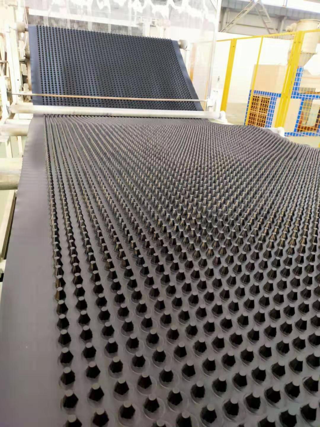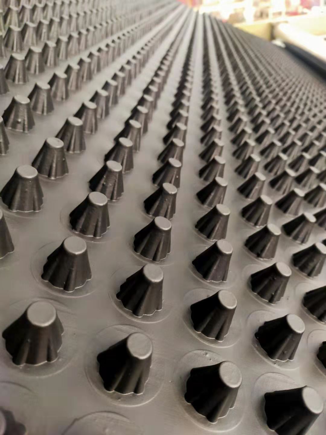 排水板由聚苯乙烯(HIPS)或聚乙烯(hdpe)塑料基板沖壓制成圓錐突臺或加強肋的凸點(或中空圓柱形多孔),寬1~2米,長度可根據(jù)客戶要求定制生產(chǎn)。